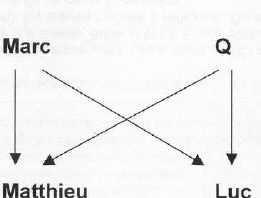 "Matthieu et Luc auraient tous deux utilisé comme point de départ la même source pour écrire, à savoir l'évangile de Marc, antérieur au leur, et un document surnommé Q (de l'allemand Quelle, source). Cette source Q - qui est une pure supposition, dans la mesure où on n'en a aucune trace - aurait regroupé les "logia" ou paroles de Jésus, dans lesquelles il aurait suffi aux deux évangélistes de puiser." (LE POINT NUMÉRO 1177)